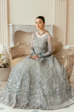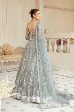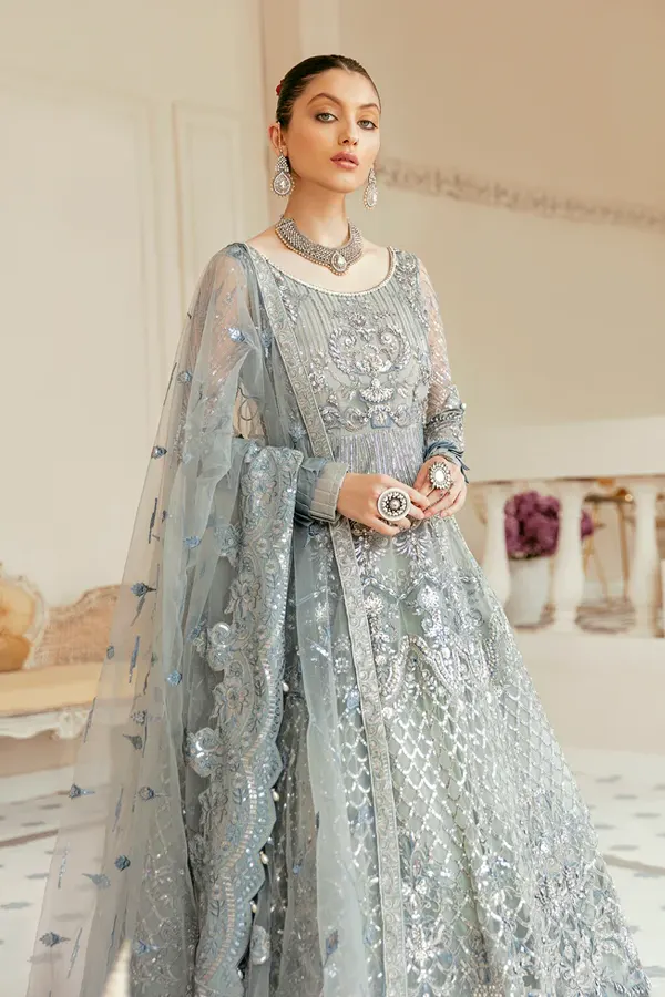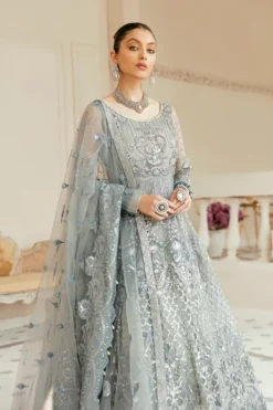 The silhouette is pure poetry. A flawlessly cut long shirt skims the frame with understated elegance, its hem adorned with a hand-embroidered border that adds just enough weight to make every movement graceful. Paired with a pure organza dupatta, intricately finished with four-side scalloped edges and delicate kiran lace, it floats like morning mist. The accompanying straight trousers, tailored from matching raw silk, complete the trio with quiet sophistication, allowing the embroidery and fabric to remain the undisputed stars.