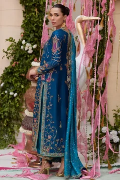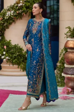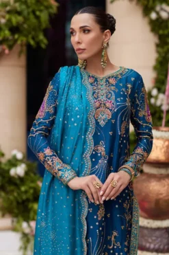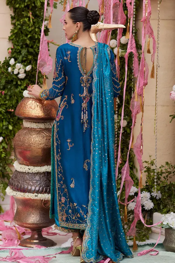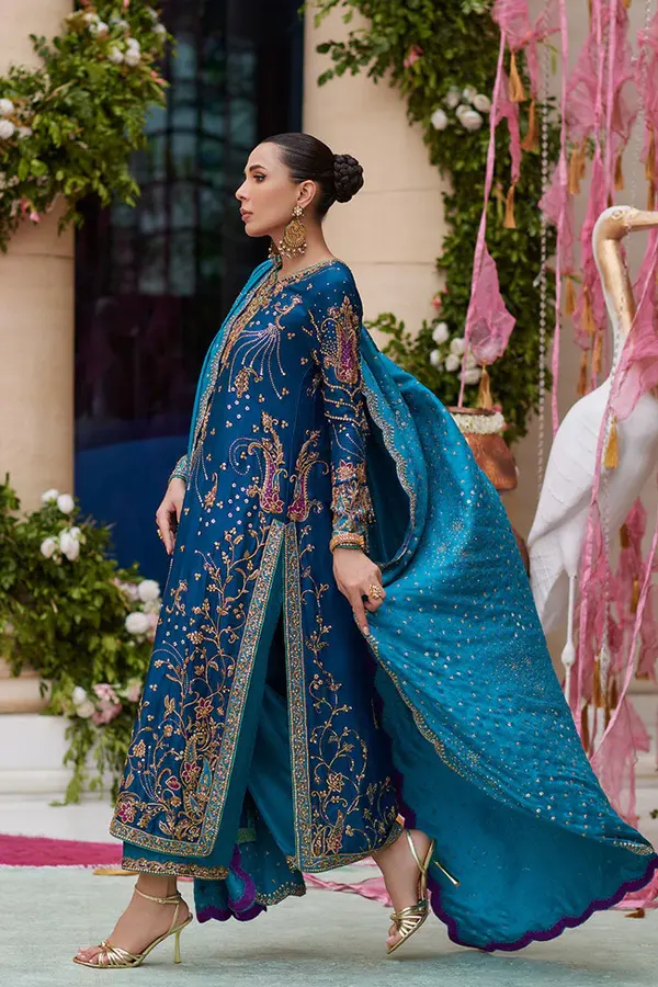 The Nihal Teal Kurta is an exquisite balance of vibrance and refinement. Its rich teal tone evokes the depth of still waters—calm, timeless, and irresistibly captivating. The color itself becomes the soul of the design, a striking yet soothing shade that flatters with quiet confidence. It reflects Farah Talib Aziz’s signature approach: translating nature’s beauty into wearable poetry.