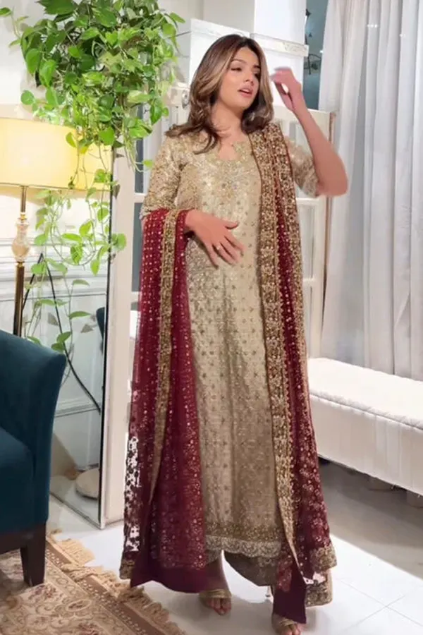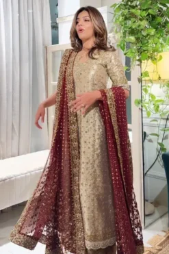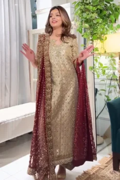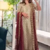 Intricate craftsmanship defines the soul of Golden Maroon. Fine embroidery glimmers across the surface like threads of light, each detail placed with precision and intention. Golden embellishments add depth and dimension without overpowering the design, offering a refined glow that enhances the ensemble’s luxurious presence. The artistry reflects a mastery of balance—ornate, yet never excessive.