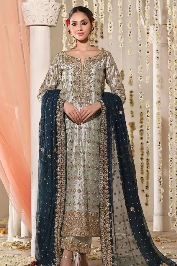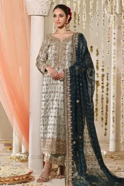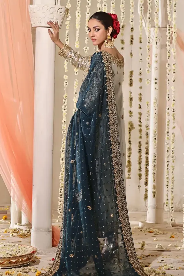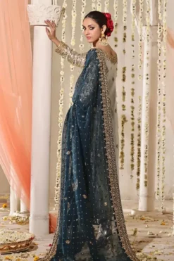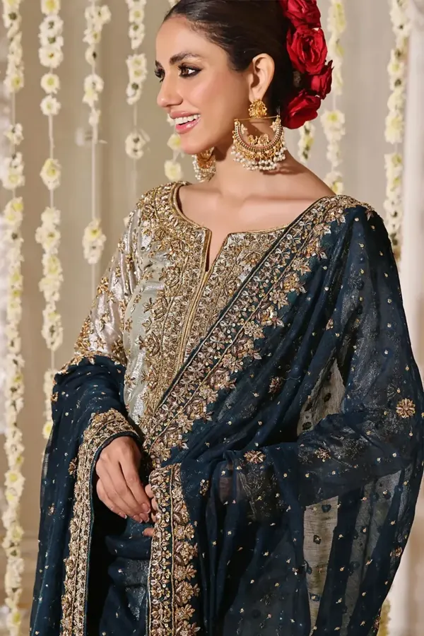Intricate craftsmanship lies at the heart of Mahnoor. Fine embroidery traces the surface with delicate precision, forming patterns that feel poetic rather than ornate. Subtle embellishments catch the light softly, adding dimension and a refined glow that enhances the ensemble’s understated charm. Each detail is placed with restraint, allowing the design to breathe and remain timeless.