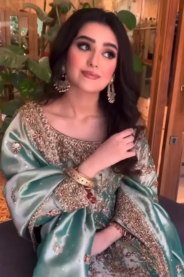 The soothing sea-green hue forms the soul of this design, evoking serenity, balance, and effortless sophistication. Accented with delicate golden details, the look radiates a soft luminosity that enhances rather than overwhelms. The interplay of color and embellishment feels intentional — subtle yet striking, gentle yet memorable.