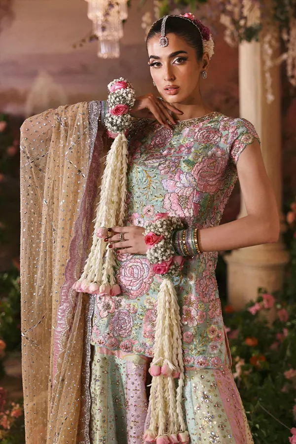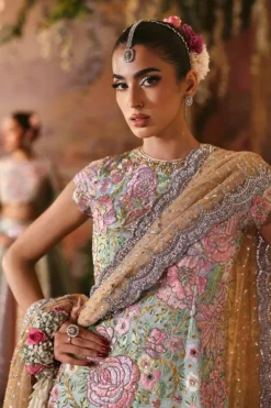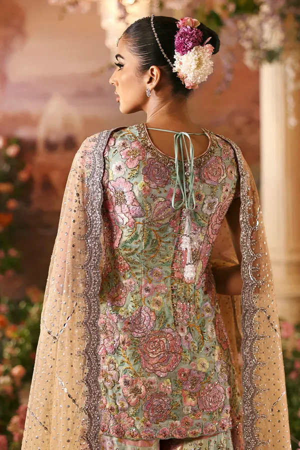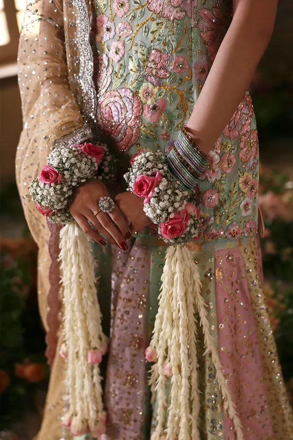 What sets Rosebud apart is its signature detailing and lively aesthetic. Known for bold creativity, Nomi Ansari brings together intricate embellishments and delicate textures in perfect harmony. Each detail is placed with intention, creating layers of depth and visual richness that make the ensemble both eye-catching and sophisticated. The design reflects a unique blend of tradition and modernity, making it truly distinctive.