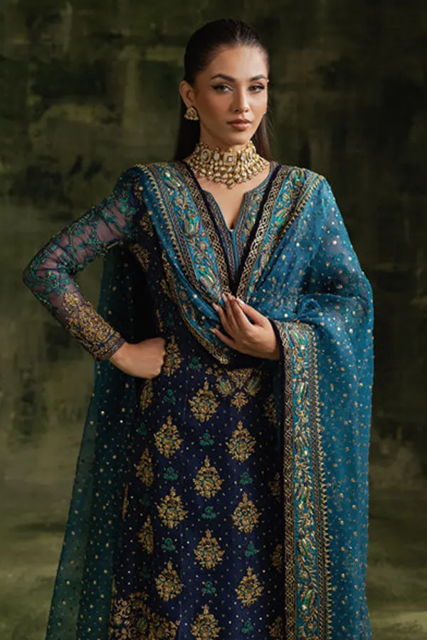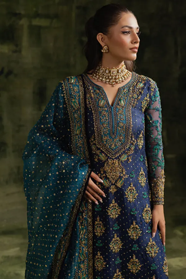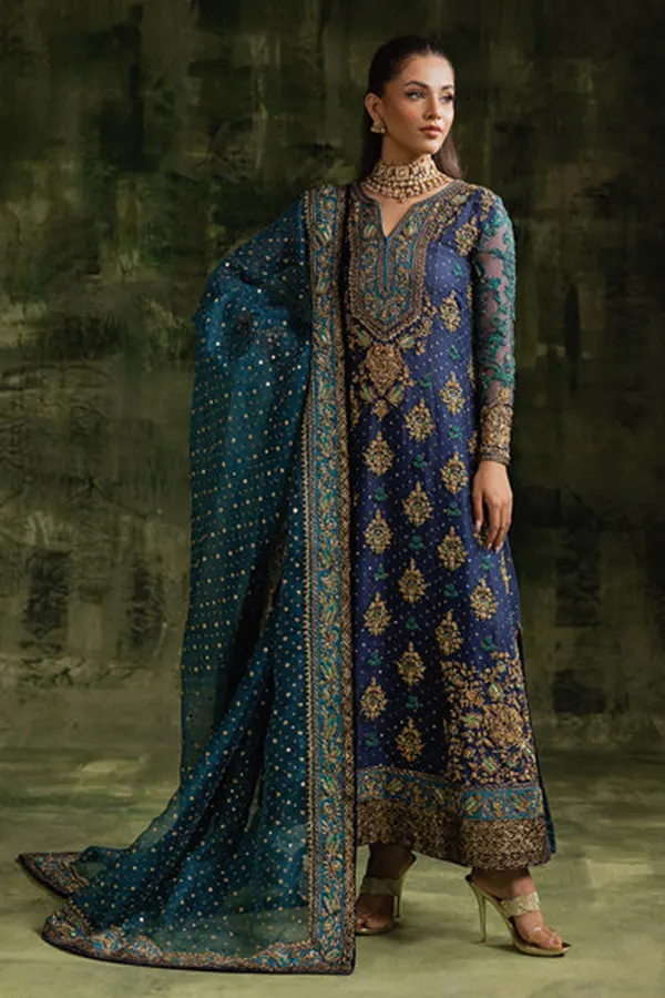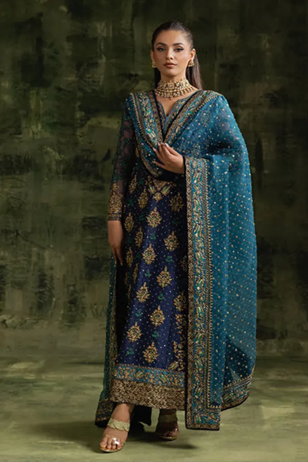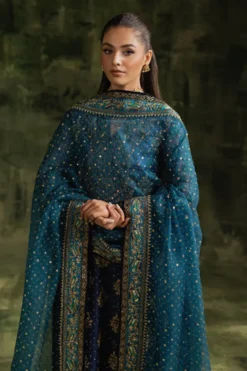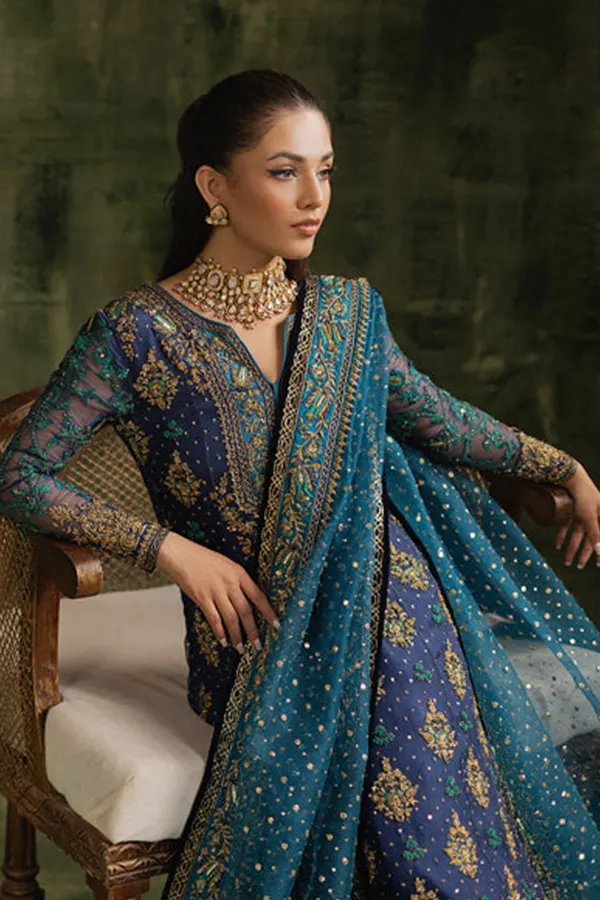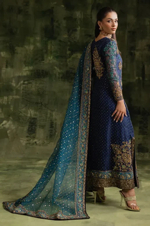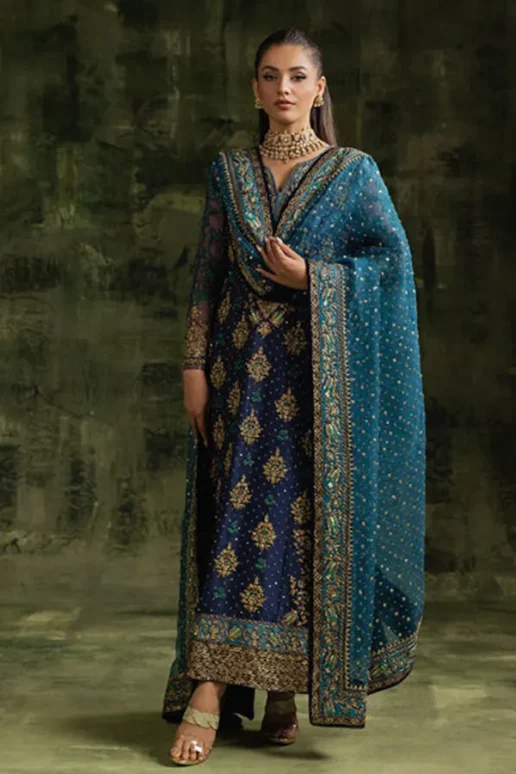 Picture the Shahbano Lehenga Ensemble, a vortex of royal cobalt cascading in layered petals of embroidered splendor. The bodice, a fortress of zardozi and resham, hugs like a lover’s vow, while the flared skirt unfurls in tidal waves of silver gota, whispering against marble floors or moonlit sands. Intricate naqshi borders trace tales of valor—peacocks in eternal flight, lotuses defying the dusk—illuminated by moonstone sequins that fracture light into prisms of power. Ideal for the bride who wields her throne with subtlety, it pairs with a velvet choli etched in pearl dalles, transforming vows into victories. In this gown, movement becomes myth: a swirl that summons storms, a pause that silences stars.