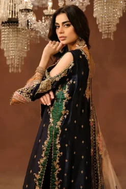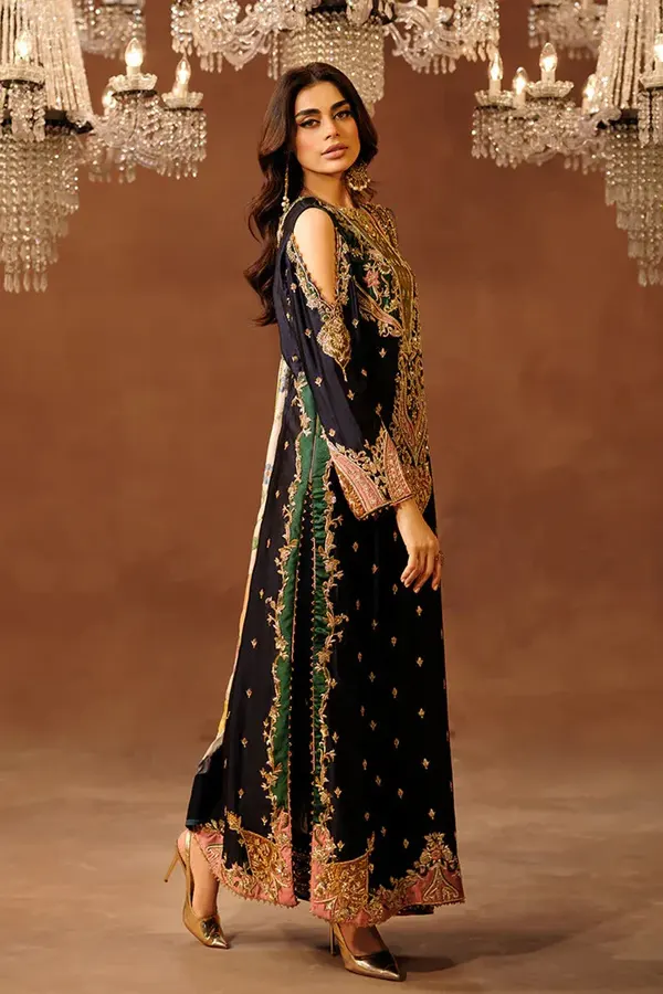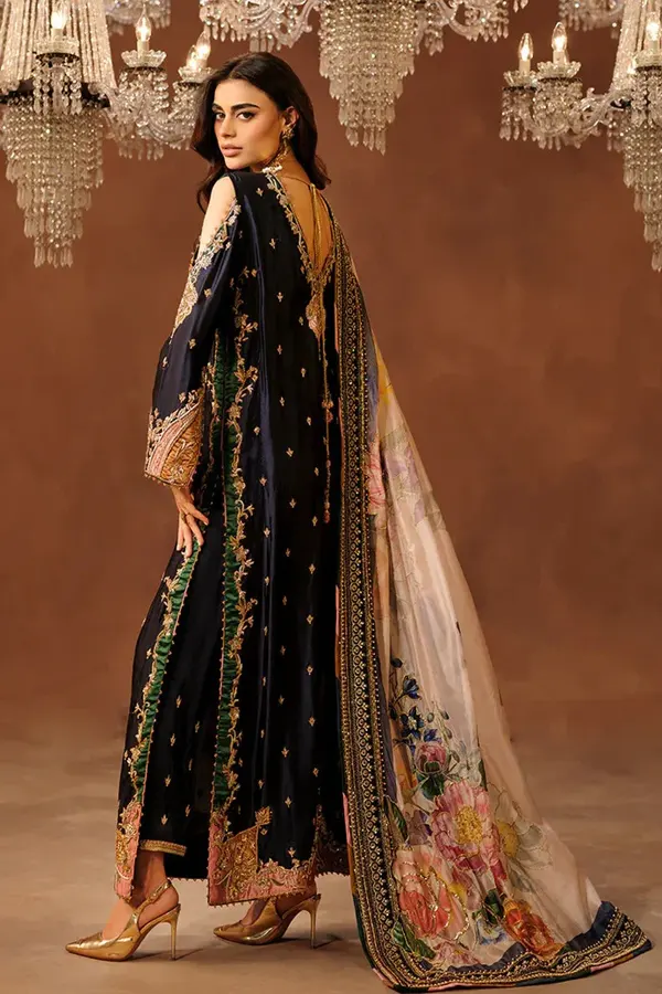 What truly defines Shahana is its intricate detailing and balanced aesthetic. Fine embellishments and delicate textures are harmoniously woven into the design, adding depth without overpowering its refined simplicity. Every element is intentionally placed, reflecting the designer’s commitment to artistry and craftsmanship. The result is a piece that feels luxurious yet effortlessly wearable.