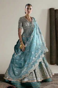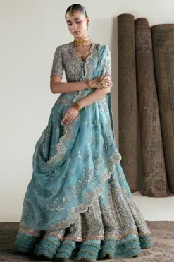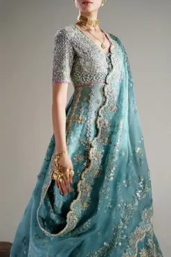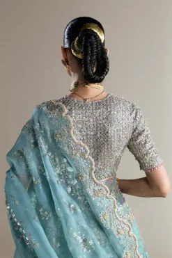 This ethereal ensemble unfolds in whispered layers of delicate organza and raw silk. A scoop-neck pishwas, gently cinched with tasselled drawstrings, blooms with botanical and geometric motifs in a silver‑gold embroidery that shimmers like moonlit petals in an evening breeze. The skirt, rich in texture, pairs raw silk with foil appliqué and a gathered border—each fold a soft ripple of light.